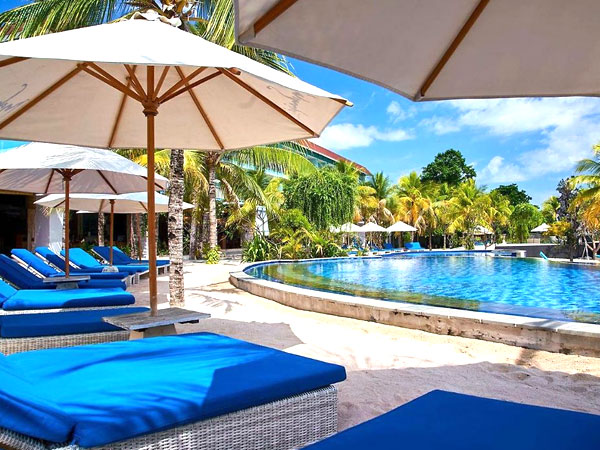 レンボンガン島の広い砂浜と広大なプールとヤシの木がたくさんある「マハギリリゾート」のプールエリアを上から望む
